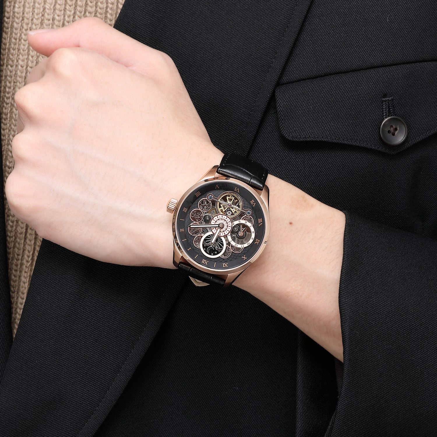 シースルーバックの裏蓋から見える、時を刻みながら複雑に重なりあうパーツの造形をぜひお楽しみください。